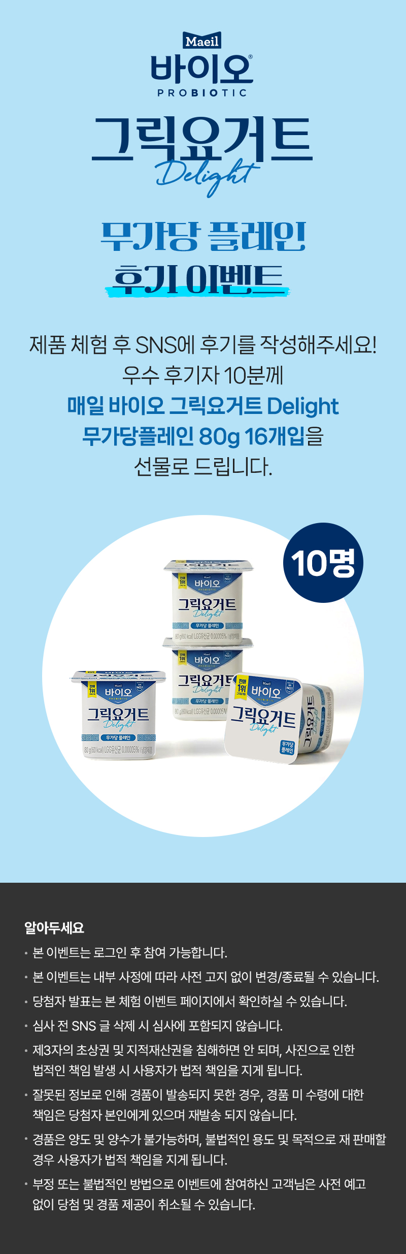 [매일바이오 그릭요거트 Delight 무가당 플레인 80g 16개입] 평소에 그릭 요거트를 좋아해서 꼭 당첨되고 싶어요