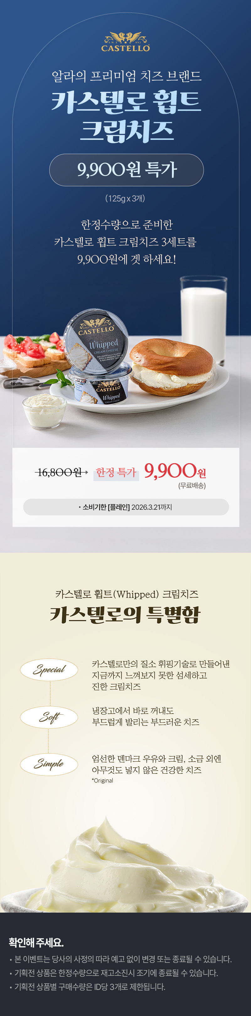 [2/4 출고예정] 알라 카스텔로 휩트 크림치즈 플레인 125g 3개_냉장