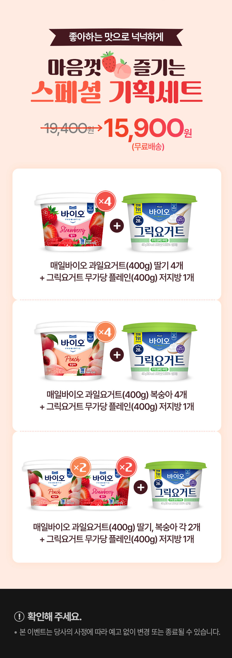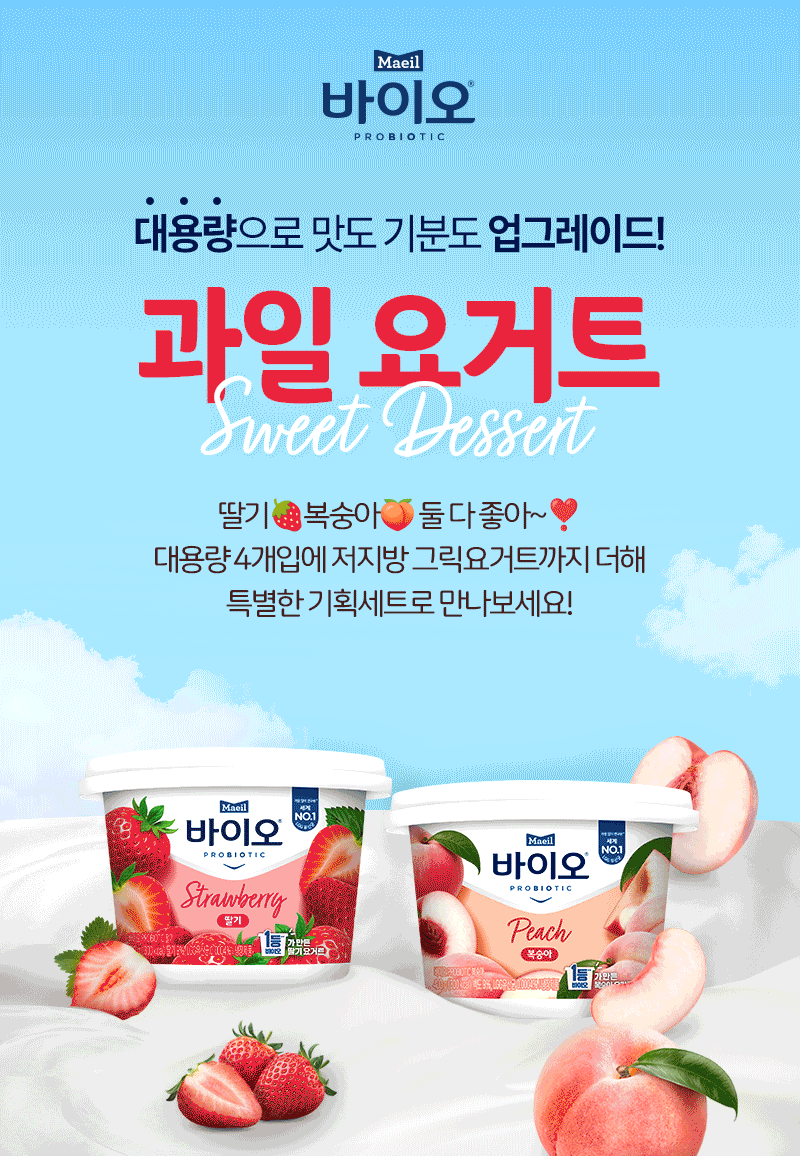 매일바이오 과일요거트400g (딸기 2개, 복숭아 2개) + 그릭요거트 무가당 플레인 저지방400g 1개