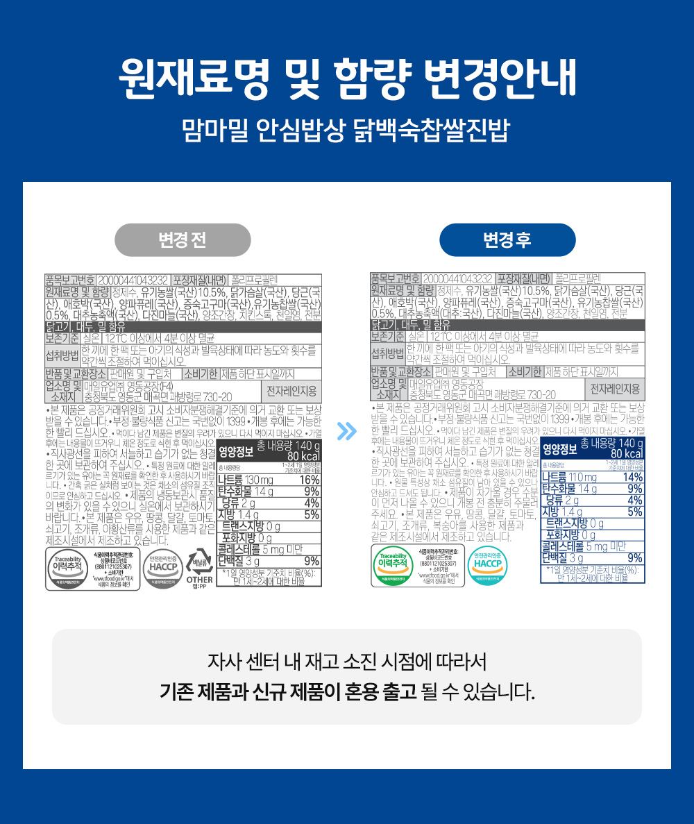 맘마밀 안심밥상 2종 140g 20팩 (닭백숙 찹쌀 10팩 + 소불고기 가지 10팩)
